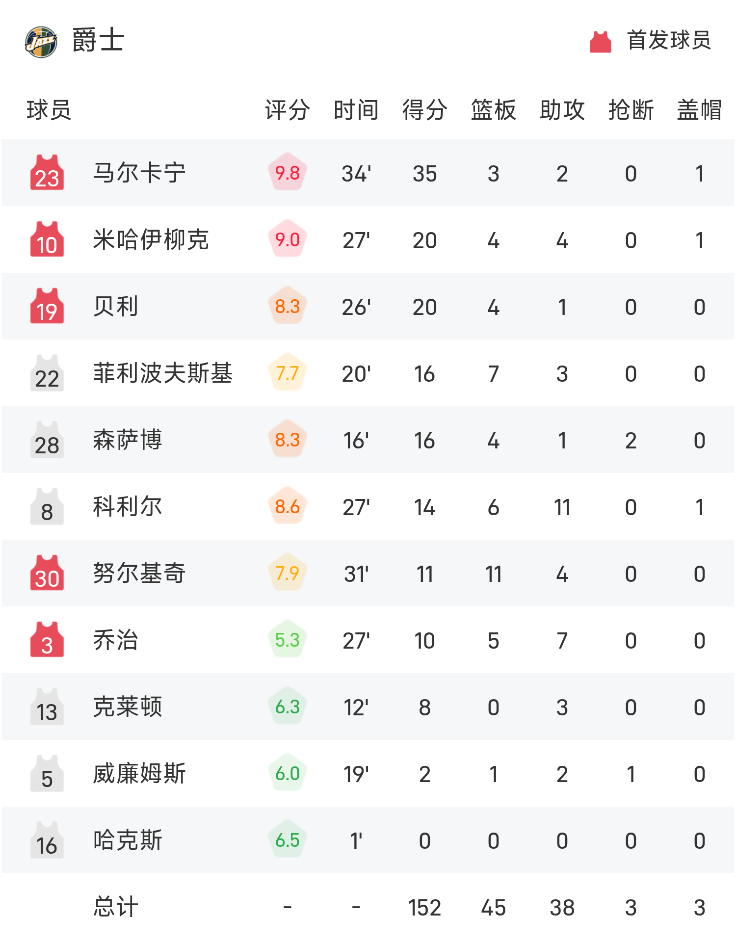 马尔卡宁砍下全场最高的35分3板2助,率领爵士胜利取胜。