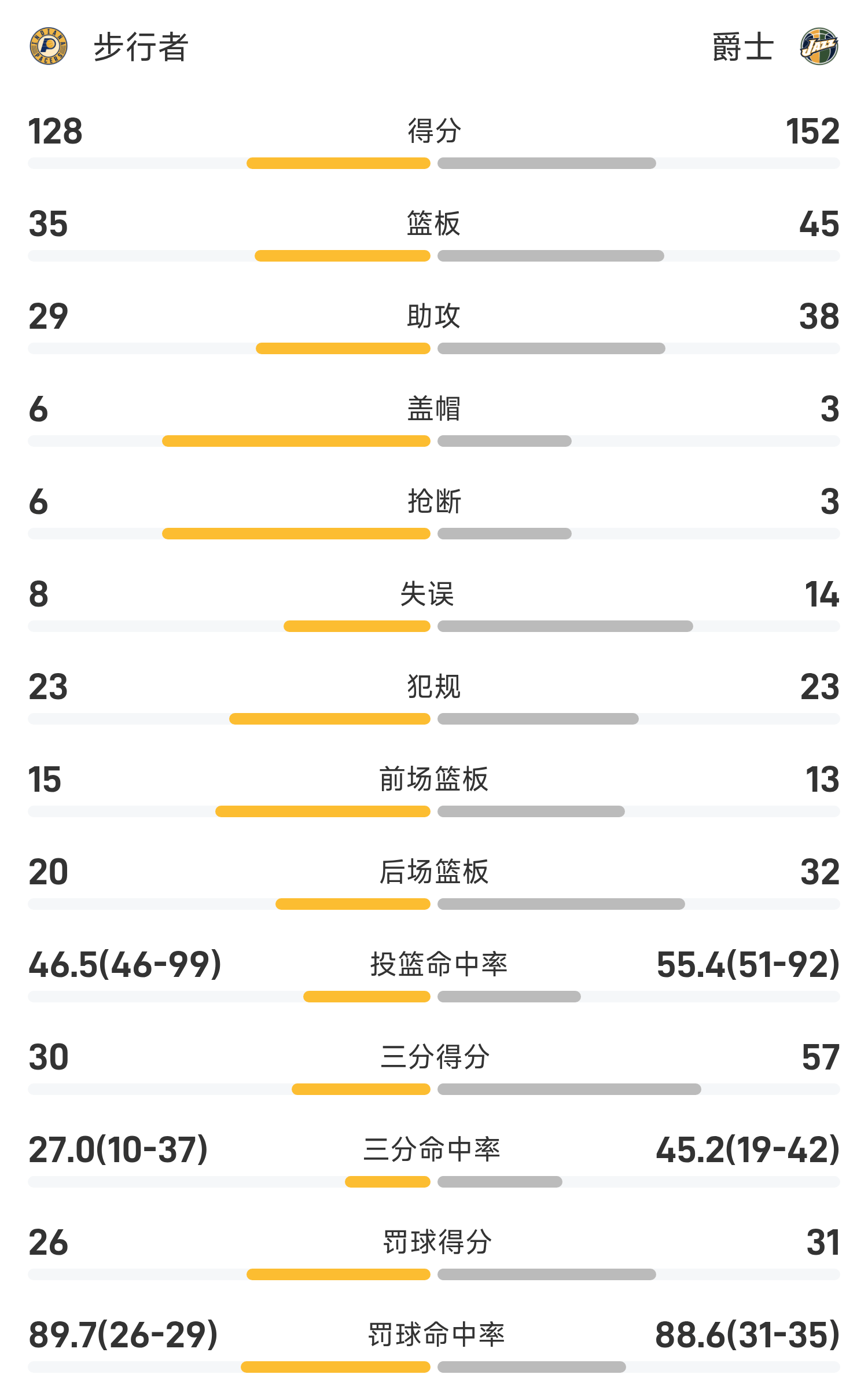 双方全场战罢,爵士152-128战胜步行者。