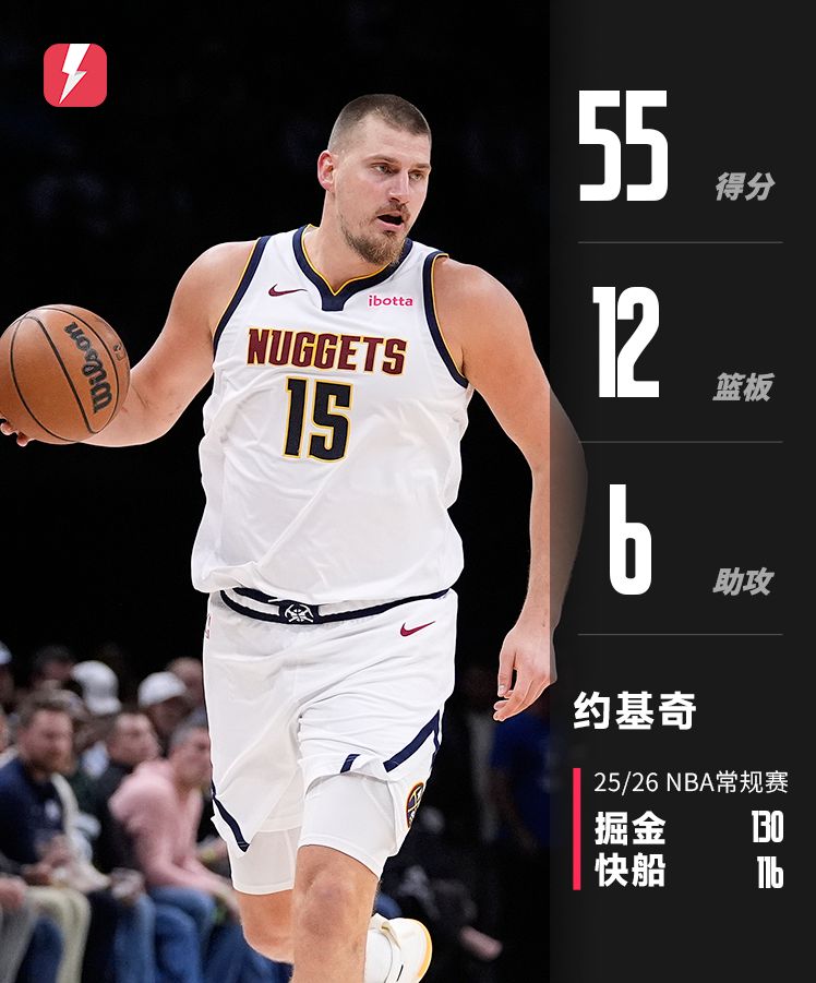 约基奇23中18狂轰55分12板6助,得分平本赛季球员单场最高