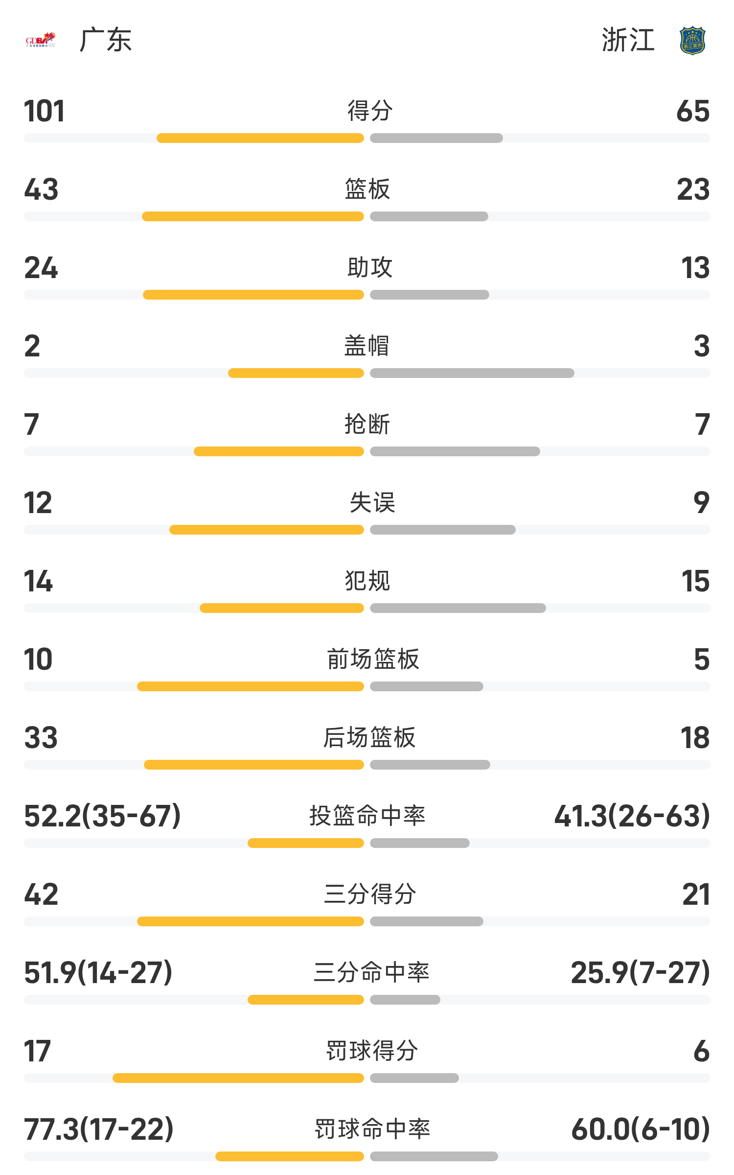 双方全场战罢,浙江65-101不敌广东。