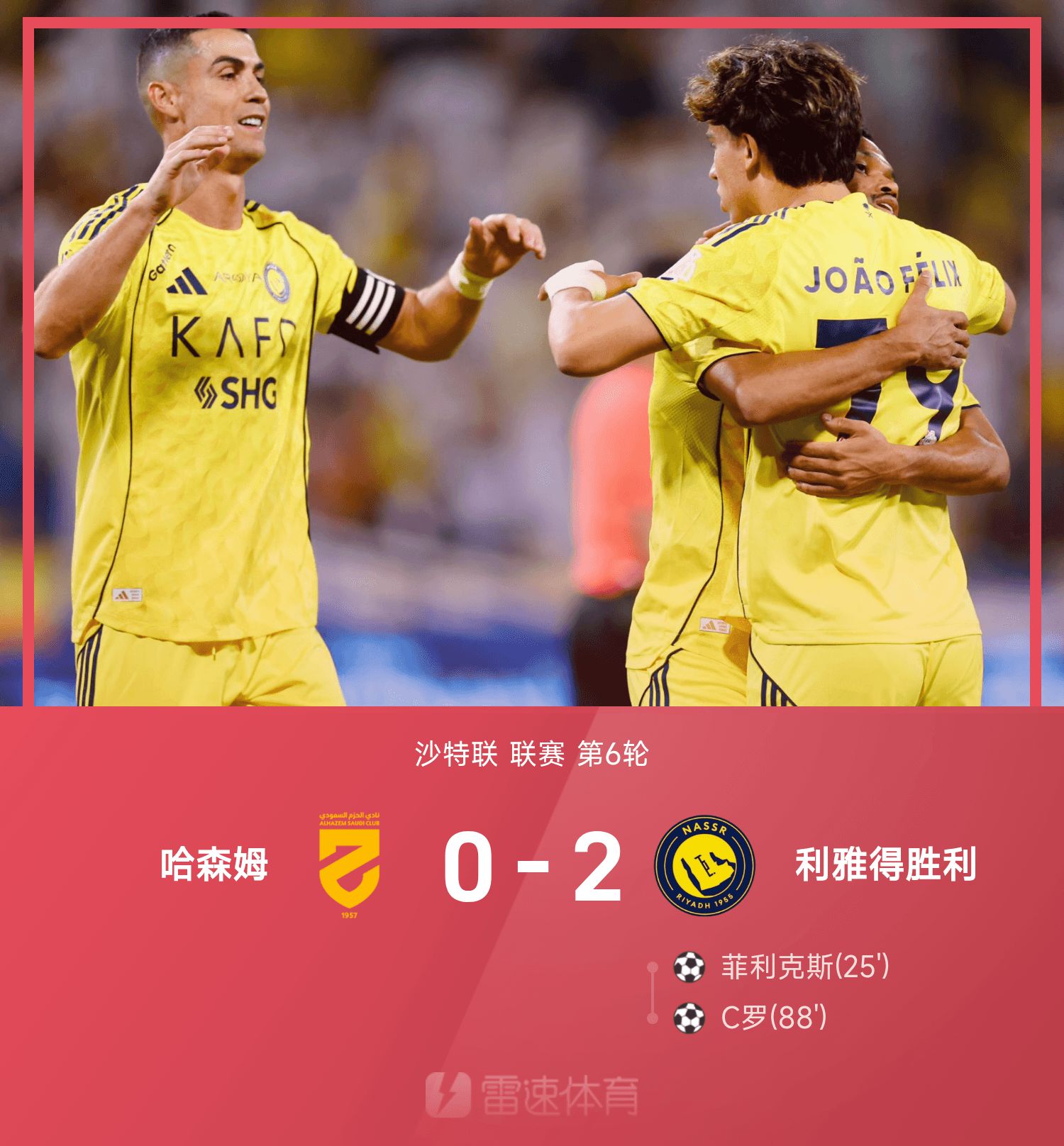 6686体育app10月26日讯 25/26赛季沙特联联赛事第6轮,利雅得胜出局2-0战胜哈森姆。上半场菲利克斯顶球破僵,下半场终结前,C罗吊射锁定胜局。最终,利雅得胜出局客队场2-0战胜哈森姆,豪取联赛事6连胜。