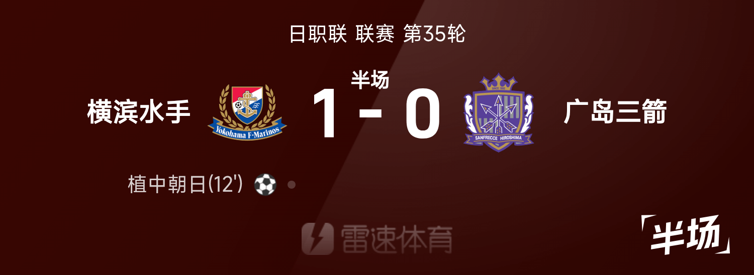 日职联半场:植中朝日建功,横滨水手暂1-0广岛三箭