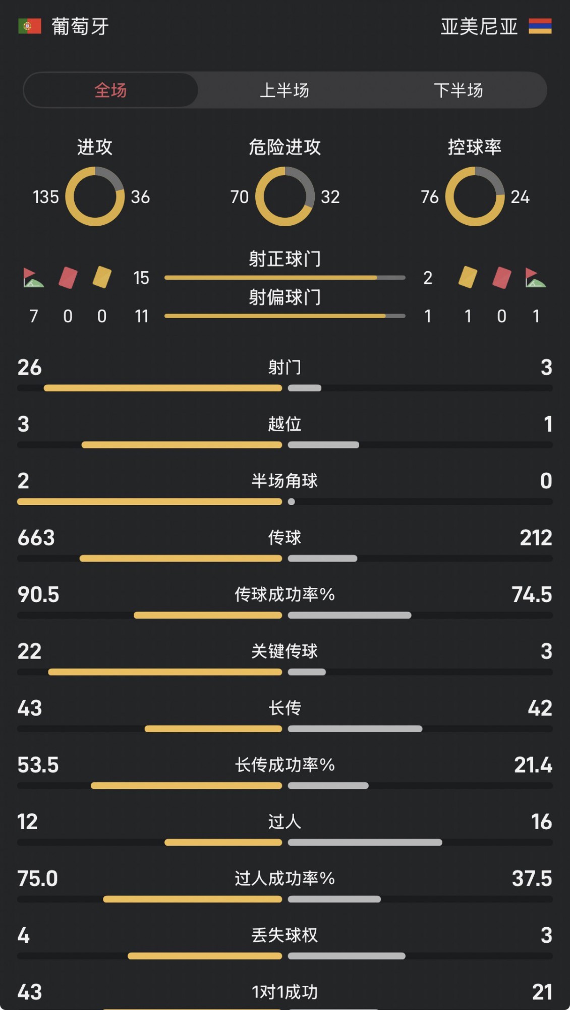 葡萄牙战亚美尼亚全场数据:盘球率76-24,打门26-3