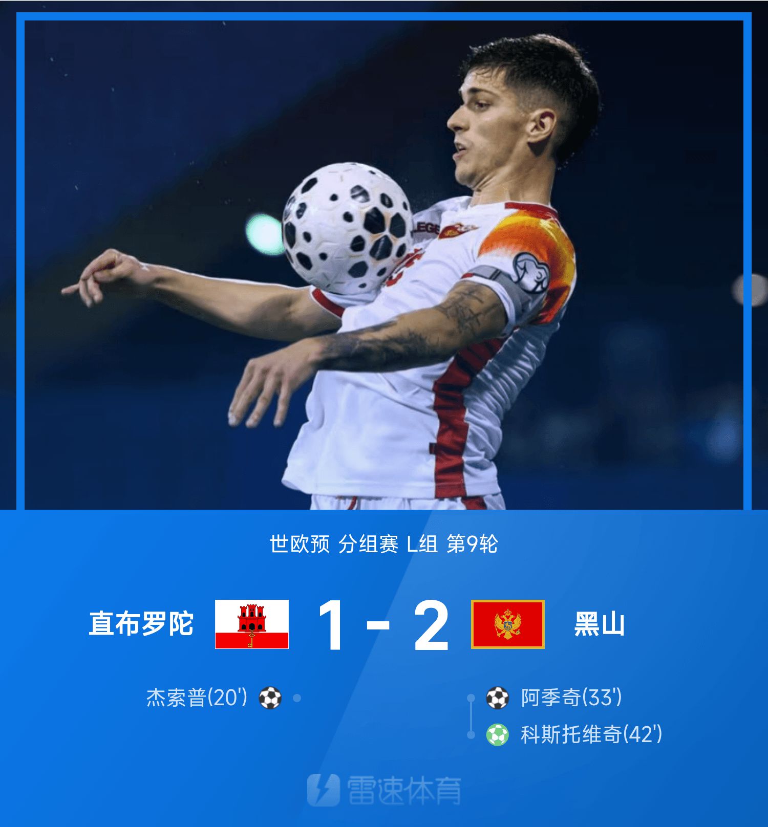 世欧预战报:阿季奇自由球破门,黑山2-1逆转直布罗陀
