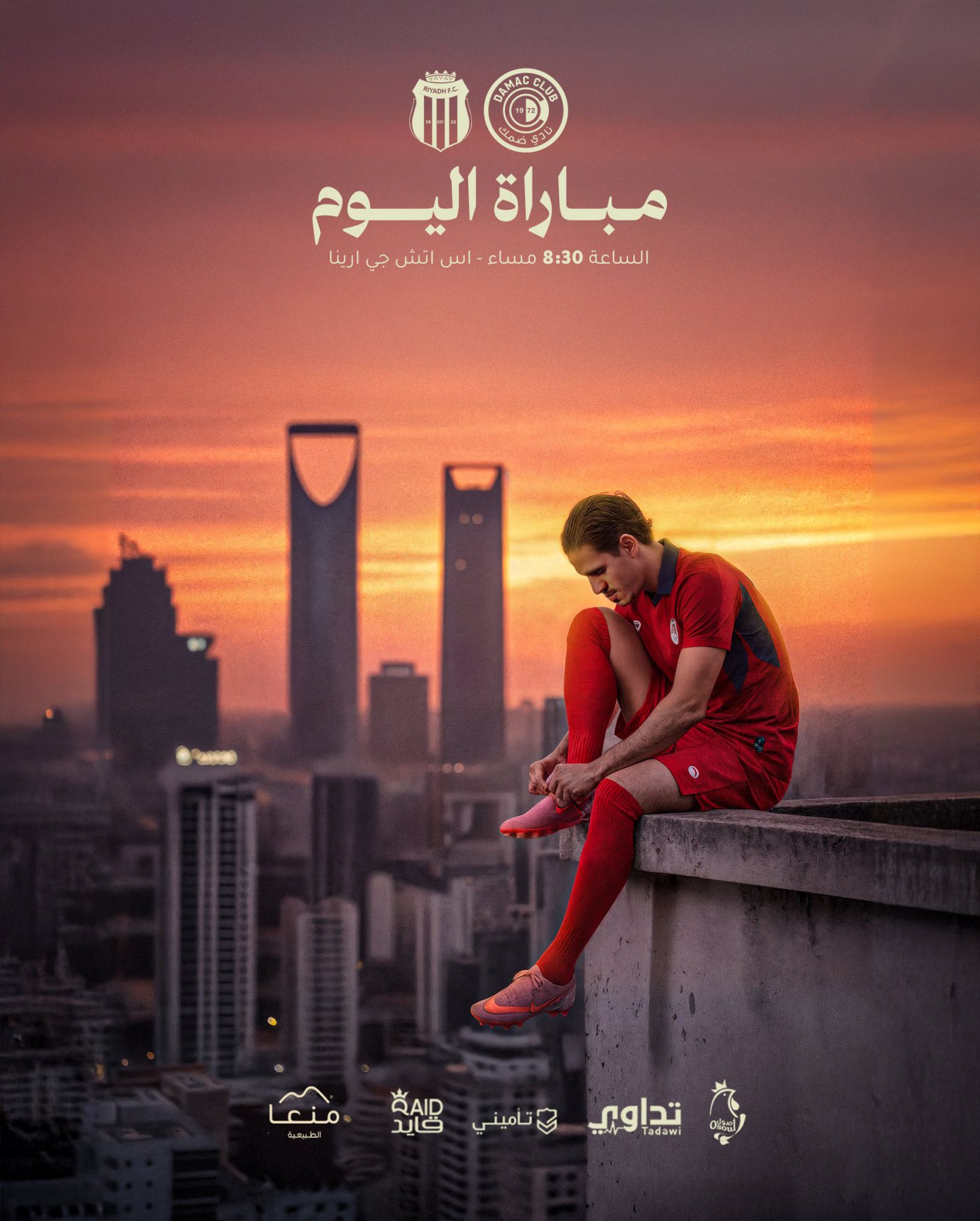 海报显示,达马克球员身穿队服坐在楼顶边缘系鞋带。