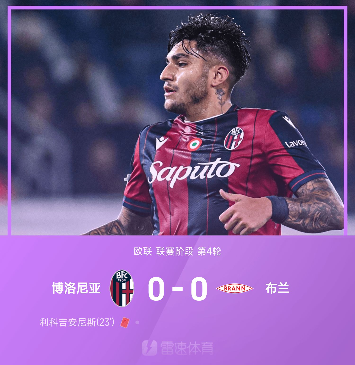欧联战报:两队合计仅三次射正,十人博洛尼亚0-0闷平布兰